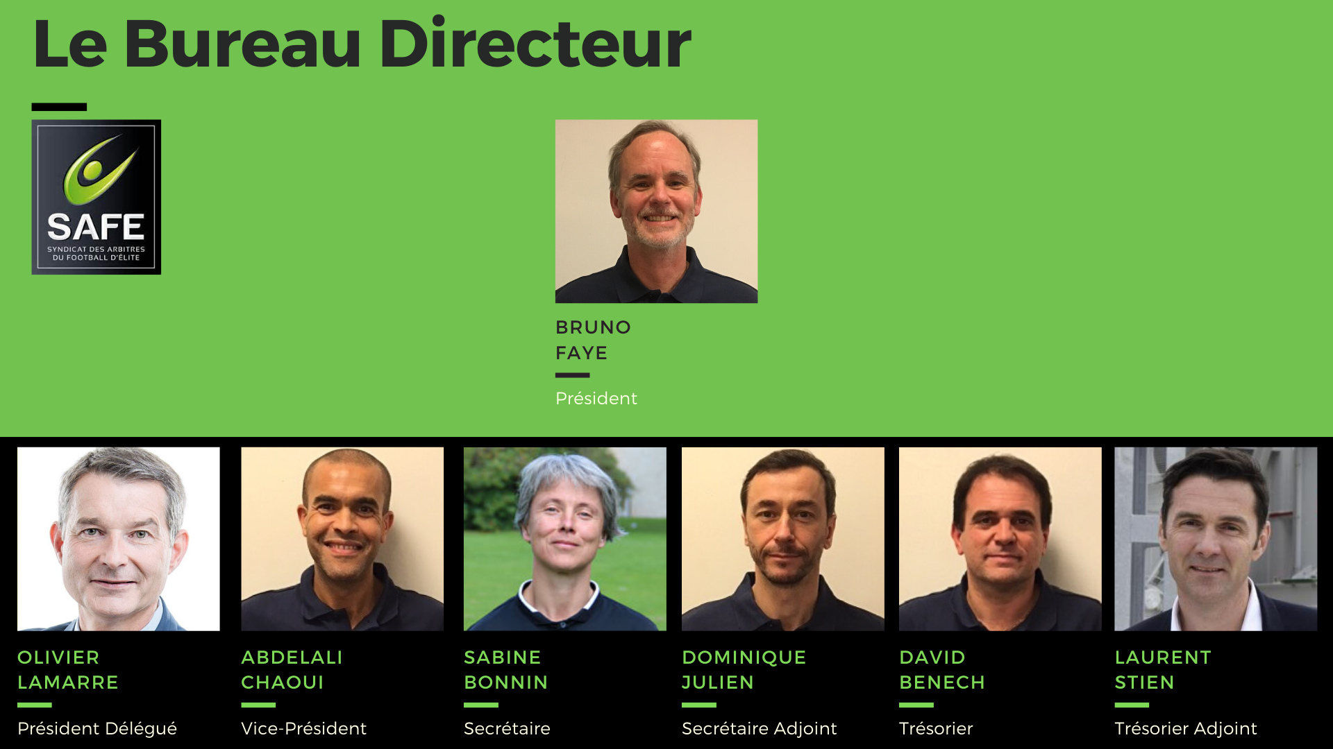 Le Bureau Directeur est composé de sept membres ayant évolué dans les compétitions professionnelles (L1, L2) comme arbitres centraux ou arbitres assistants, et désormais d’une représentante des arbitres féminines. La composition du Bureau du SAFE pour le mandat 2020-2023 :