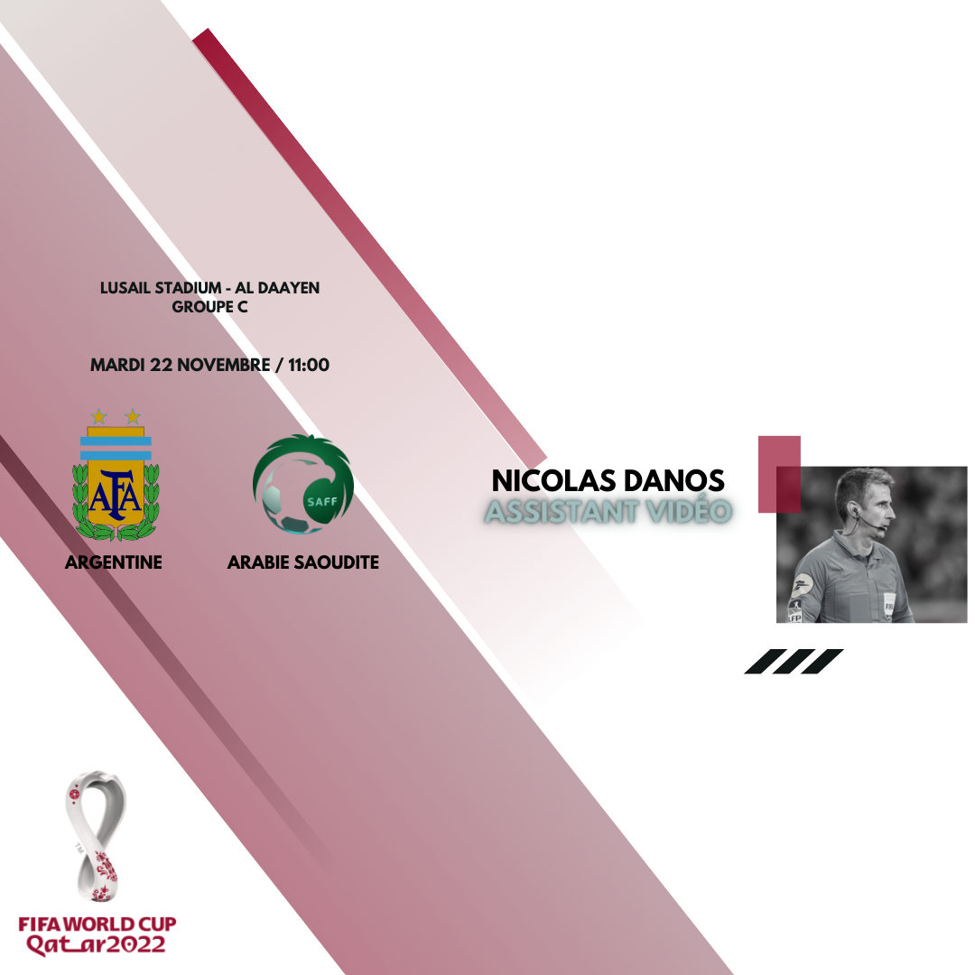 Nicolas DANOS pour Argentine - Arabie SaouditeNicolas DANOS sera arbitre assistant vidéo de l'équipe arbitrale emmenée par Slavko VINCIC (Slovénie) pour le match du groupe C de la Coupe du Monde 2022 entre l'Argentine et l'Arabie Saoudite !