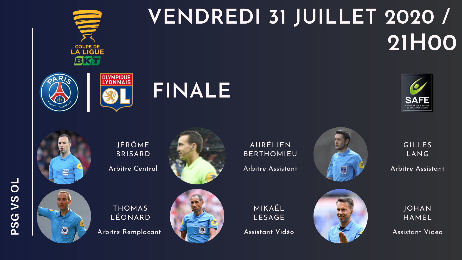 En Coupe de la Ligue BKT, Jérôme BRISARD dirigera sa première finale dans la compétition. Il sera assisté d'Aurélien BERTHOMIEU et de Gilles LANG. Thomas LEONARD sera lui le 4ème arbitre du match, tandis que Mikaël LESAGE et Johan HAMEL seront assistants vidéo.