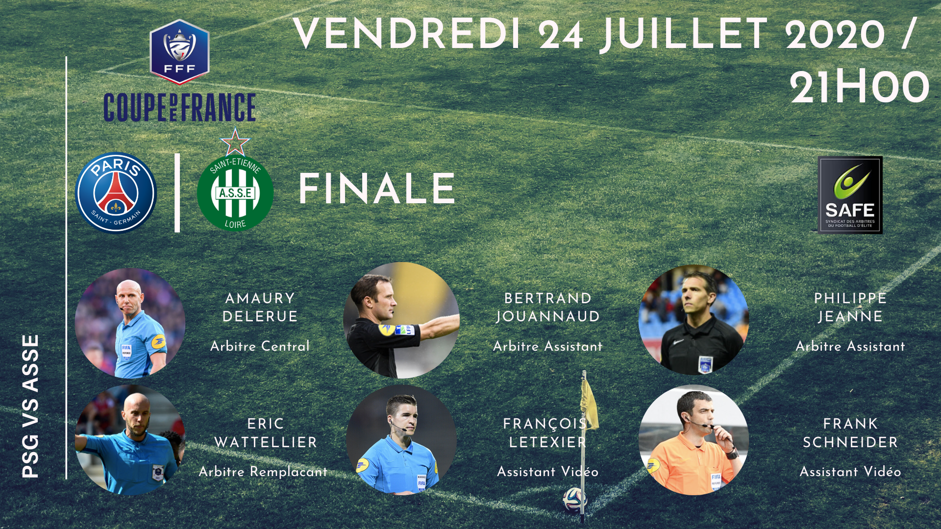 Pour la finale de la Coupe de France, l’équipe arbitrale sera emmenée par Amaury DELERUE, assisté de Bertrand JOUANNAUD et de Philippe JEANNE. Éric WATTELLIER sera le 4ème arbitre de la rencontre. François LETEXIER et Frank SCHNEIDER complètent l’équipe en tant qu’assistants vidéo.