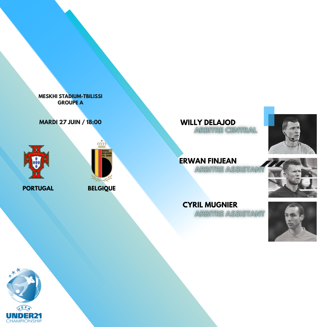 Willy DELAJOD, Erwan FINJEAN et Cyril MUGNIER officieront sur le match de la phase de groupes de l'Euro Espoirs entre le Portugal et la Belgique !