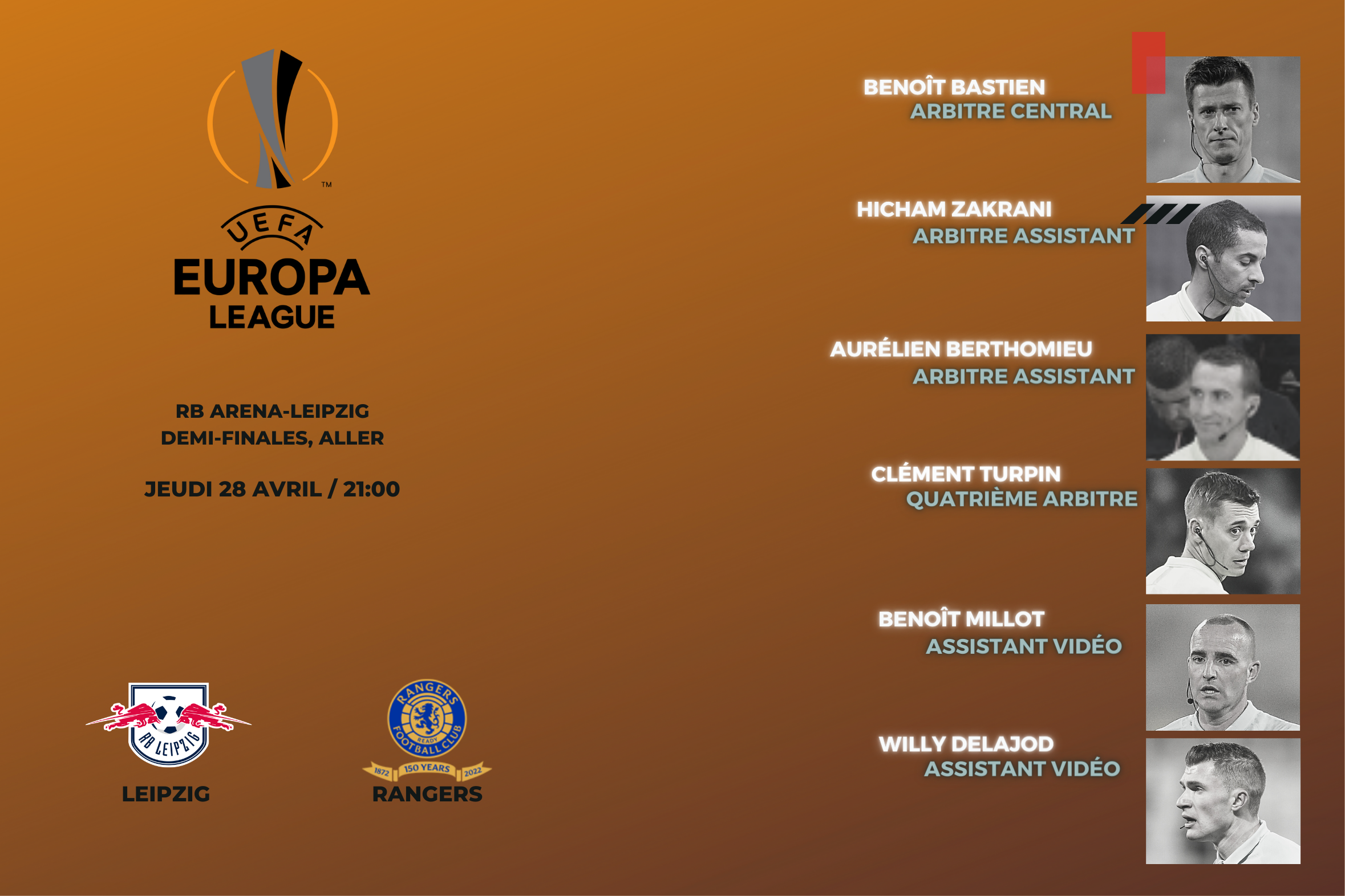 Benoît BASTIEN pour Leipzig - RangersBenoît BASTIEN sera accompagné d'Hicham ZAKRANI, Aurélien BERTHOMIEU, Clément TURPIN, Benoît MILLOT et Willy DELAJOD pour la demi-finale aller de l'UEFA Europa League entre le RB Leipzig et les Rangers !