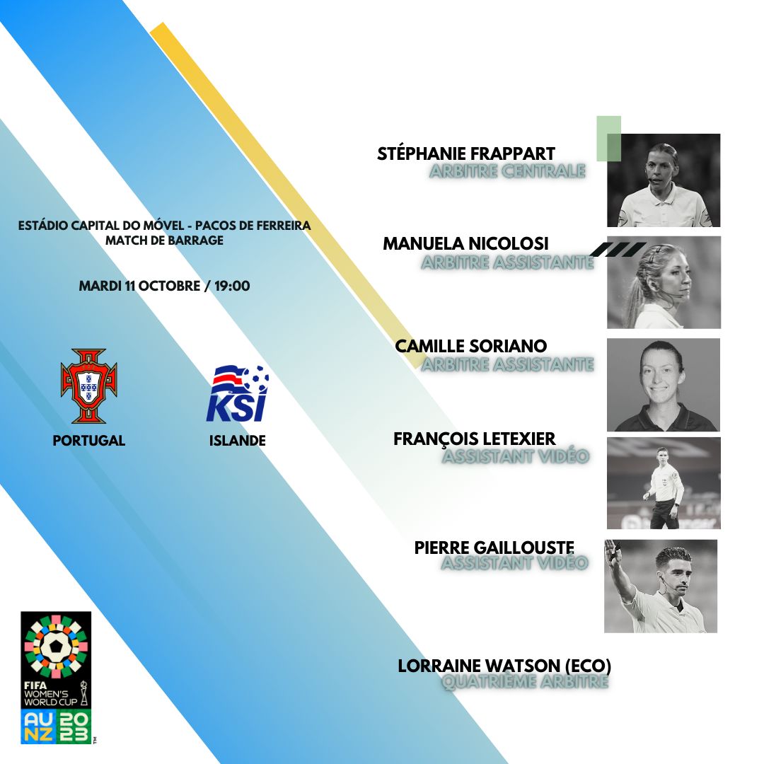 Stéphanie FRAPPART pour Portugal - IslandeStéphanie FRAPPART sera accompagnée de Manuela NICOLOSI, Camille SORIANO, Lorraine WATSON (ECO), François LETEXIER et Pierre GAILLOUSTE pour le Barrage à la Coupe du Monde Féminine 2023 entre le Portugal et l’Islande !