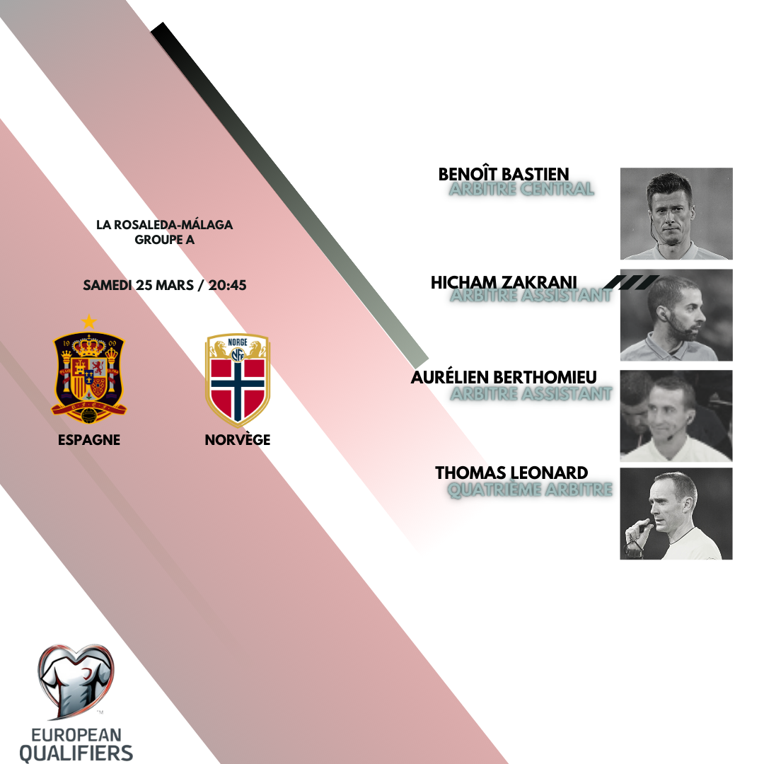 Benoît BASTIEN sera accompagné d'Hicham ZAKRANI, Aurélien BERTHOMIEU et Thomas LEONARD pour le match de qualification à l'Euro 2024 entre l'Espagne et la Norvège !