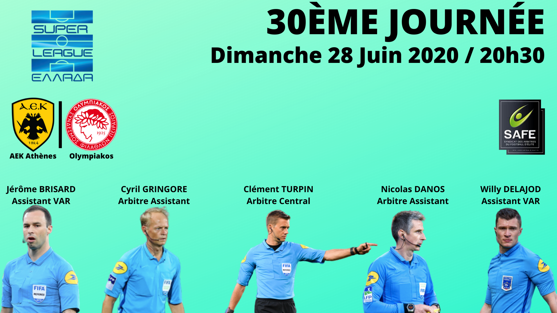 Des arbitres français en SuperLeague GrecqueLa rencontre entre l'AEK Athènes et l'Olympiakos Le Pirée sera dirigée par une équipe d'arbitres français. Clément TURPIN officiera en tant qu'arbitre central, assisté de Nicolas DANOS et Cyril GRINGORE. Jérôme BRISARD et Willy DELAJOD seront assistants VAR. Le match aura lieu ce dimanche 28 juin à 20h30.